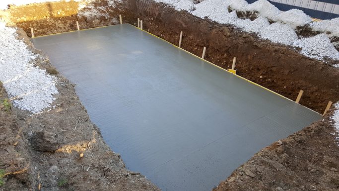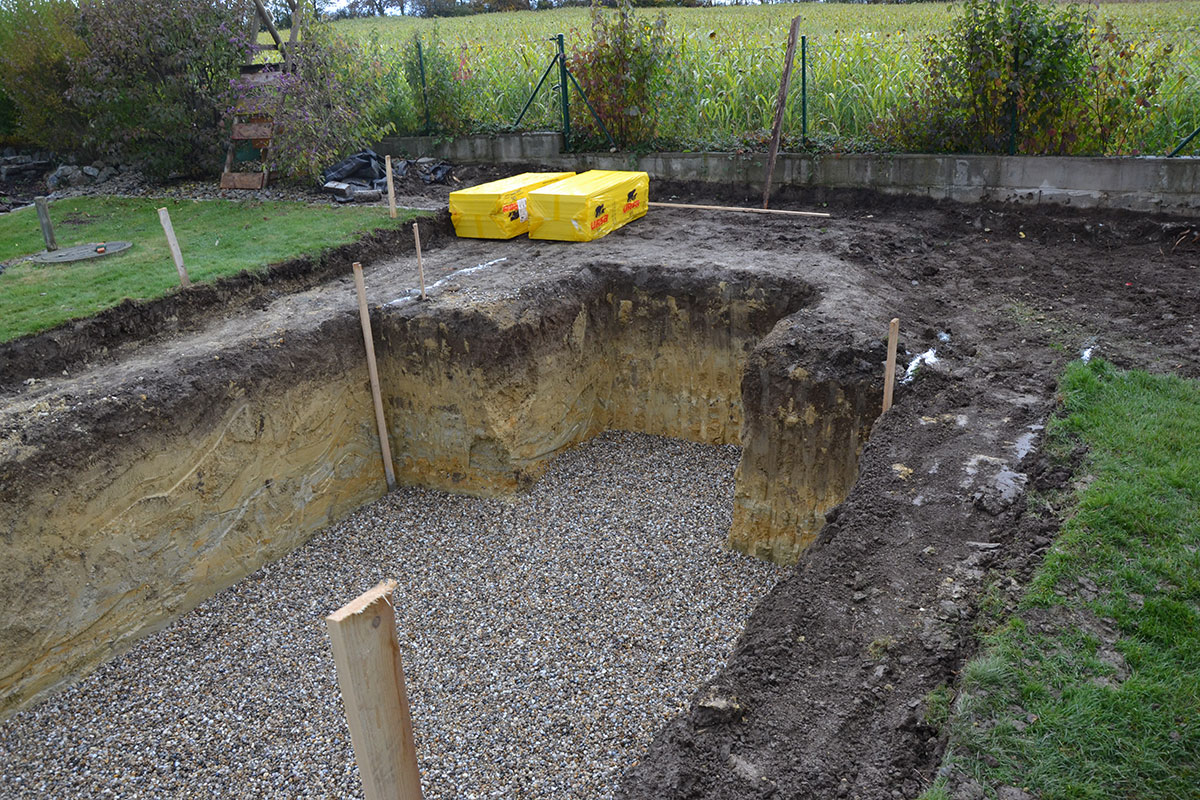 Frostschutz, Sauberkeitsschicht, bewehrte Bodenplatte, Auflager/Unterzüge für Styro-/Schalstein- oder GFK-Becken.
